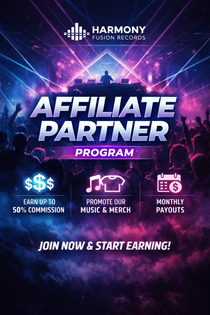 The Harmony Fusion Records Affiliate Partner Program allows approved partners to earn commission by promoting our official music releases, merchandise, and digital products.